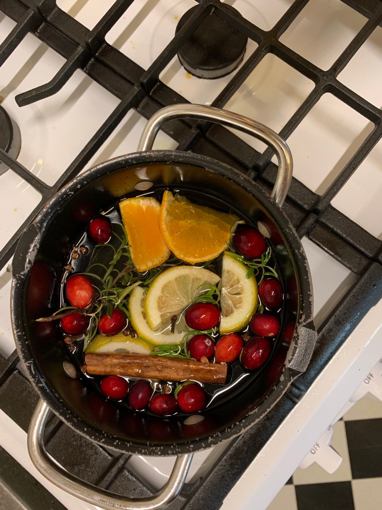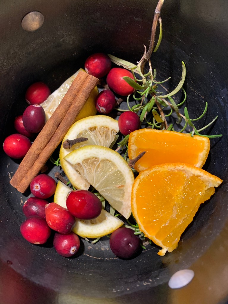 Years ago, I found a recipe for simmering scents that bring a sense of the holidays to our home. I made a batch recently. I love that the ingredients are all-natural and incorporate my favorite holiday smells. There are no exact measures on this for the ingredients. If that makes you uneasy, the photos will help. Once you get more adventurous, play around with various amounts of this or that and see what scent gets the emphasis.
