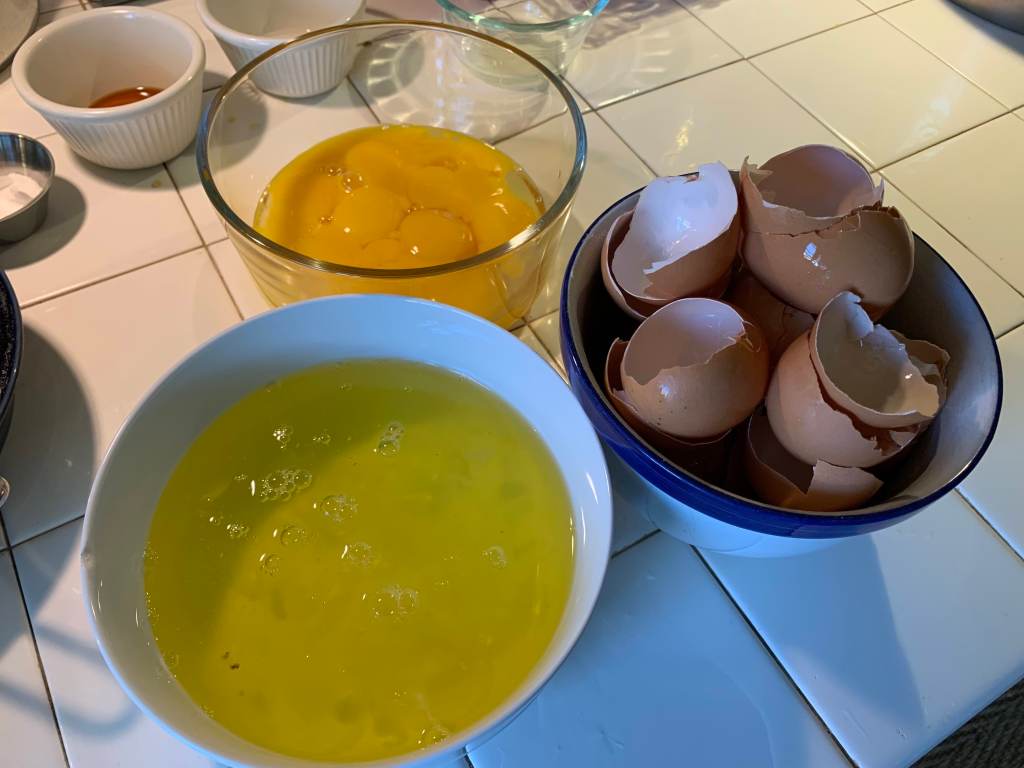 Separating the eggs does not mean placing them around the house one by one like for an Easter egg hunt. I am intimidated by the work it takes to get that white away from the yolk. It hasn’t always gone well in the past. I set my expectations lower this round. I went for “good enough” and “close enough.” After doing this twelve times, I was relieved to get to the last one! What do you do with the yolks?