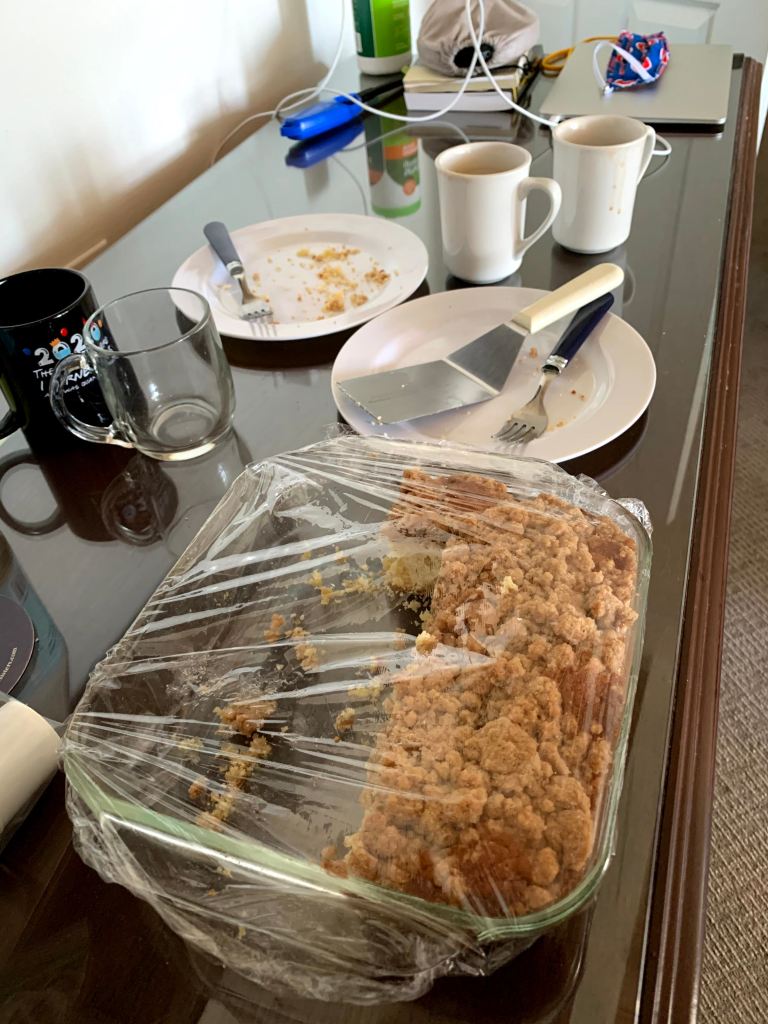 We brought our own breakfast buffet: sourdough coffee cake that Glen had made, and slices of cheese. We ate this both Saturday and Sunday with coffee.