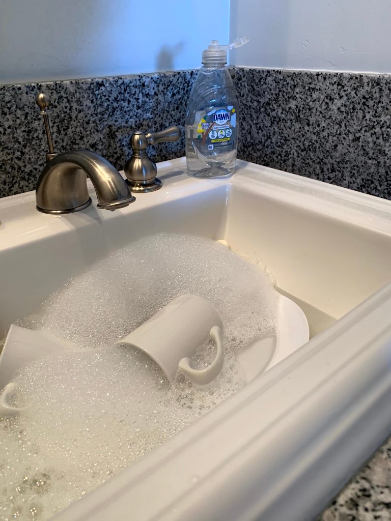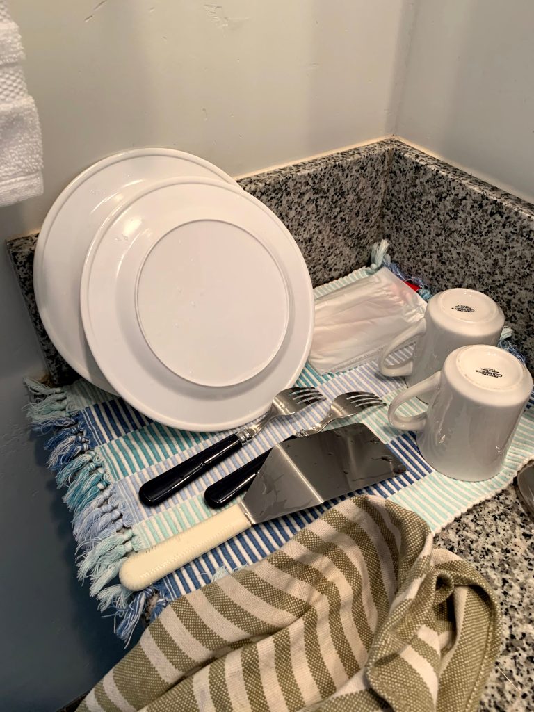 Since there was no housekeeping, and we’d brought plates and utensils from home, I did the dishes in the bathroom sink with dish soap, dish cloth, and a drying towel brought from home.